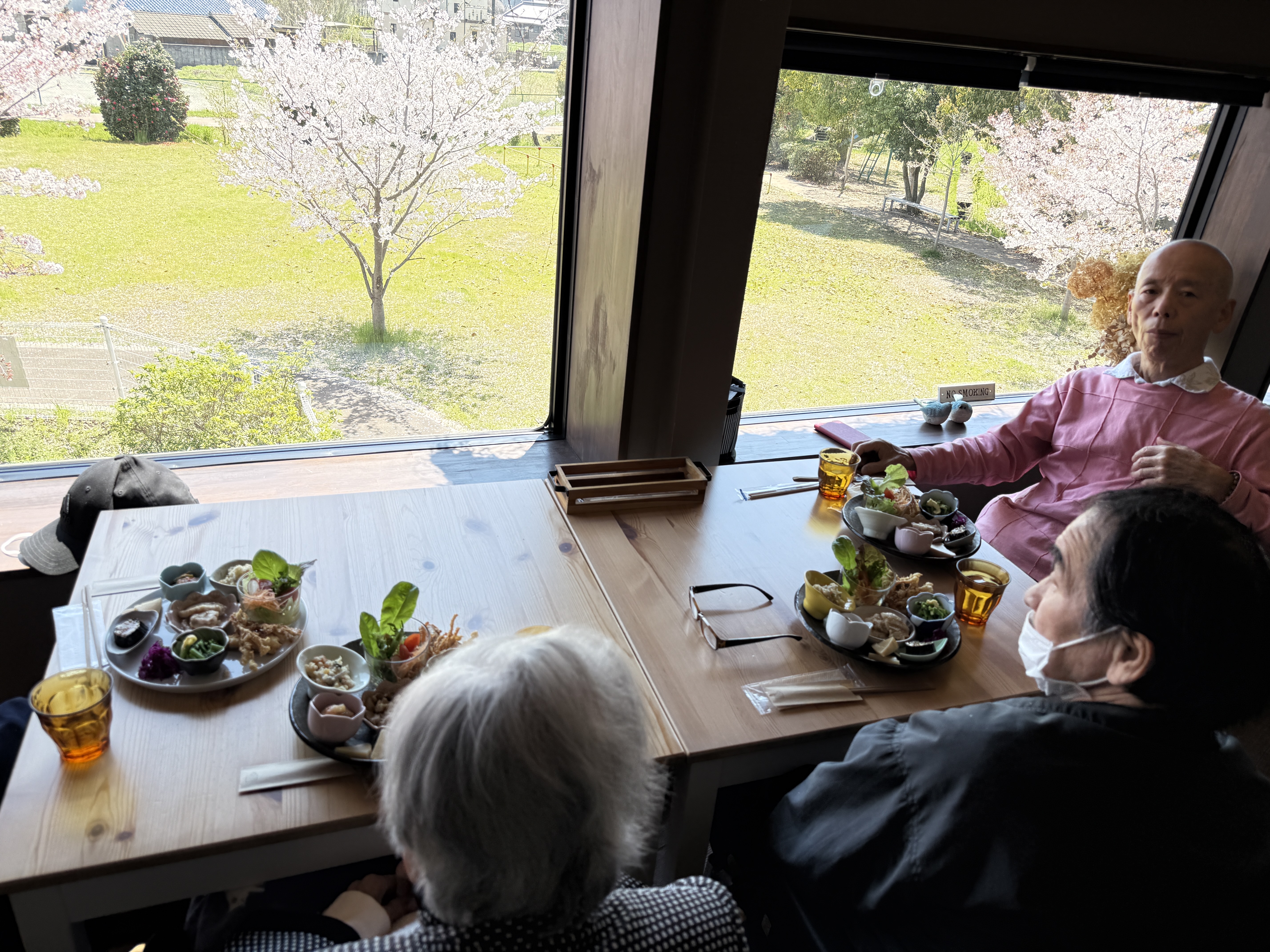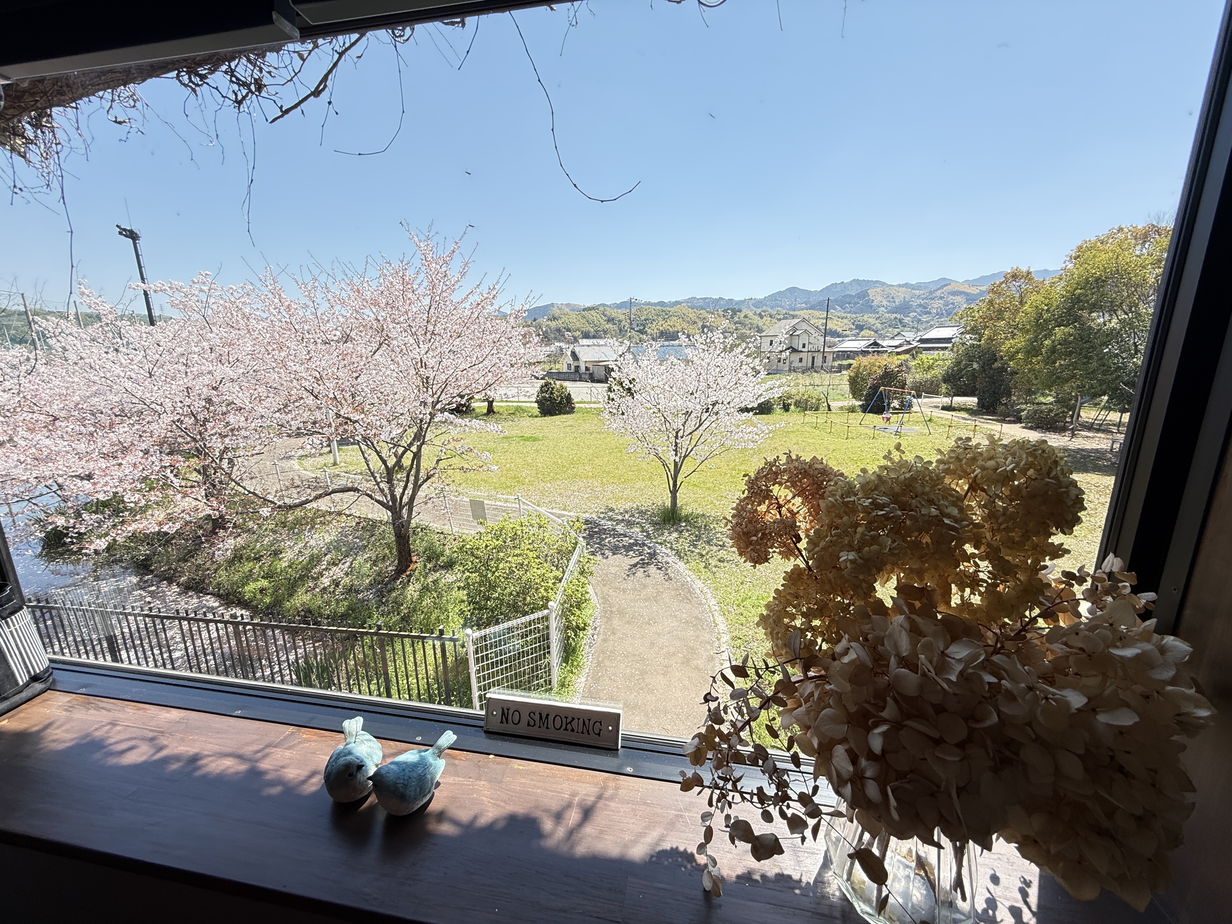 何よりの御馳走は、大きな窓から見えるこの景色!快晴の空、公園の緑、そして咲き誇る桜のコントラストが鮮やかに広がります。🌸🌿💙