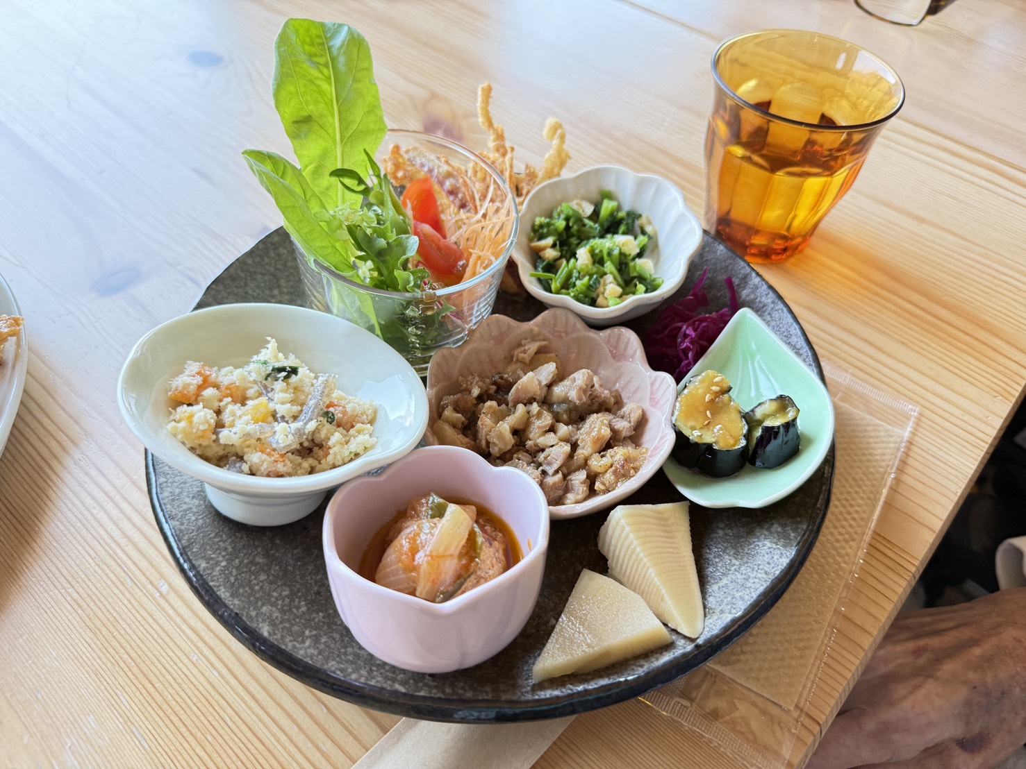 目にも鮮やかなおかずが並ぶプレートには、春を感じるタケノコや、素材の味を活かした和え物など、身体が喜ぶお料理ばかり!